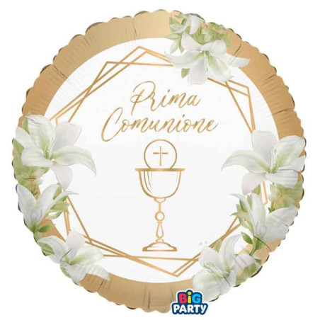 Pallone Prima Comunione - Bianco e Oro con Gigli bianchi - PALLONCINO in foil Mylar - 45CM - gonfiabile ad aria o elio - FORNITO SGONFIO