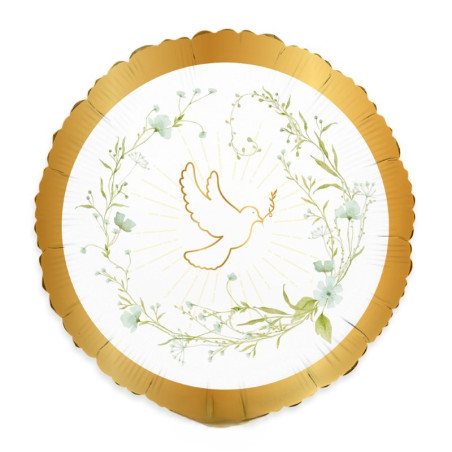 Pallone stampa colomba con fiorellini - Prima Comunione Confirmation - Bianco, Oro e verde con stampa colomba - PALLONCINO in foil Mylar - 45CM - gonfiabile ad aria o elio - FORNITO SGONFIO