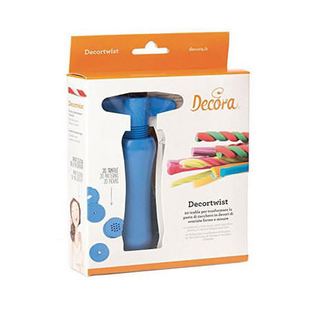 Un attrezzo, 20 trafile per creare i decori che vuoi!!!Decortwist trasforma la pasta di zucchero in cordoncini di svariate forme e misure per decorare torte e dolciComposto di serbatoio,1 ghiera dove inserire le trafile, 20trafile differenti tra loro per creare altrettanti decori e cordoncini, 1 vite e 1 tampone (il quale andrà sfilato nel momento in cui utilizzerete la Decortwist, e riposizionato nel momento in cui deporrete l'attrezzo al termine del lavoro).L'attrezzo DECORTWIST è un brevetto Decora, studiato assieme ad alcuni professionisti del settore.La sua forma ergonomica permette di non lasciare residui al suo interno.DECORTWIST è lavabile in lavastoviglie e totalmente prodotto in ItaliaDimensioni:Corpo lungo 10cm, diametro interno 2,3cm