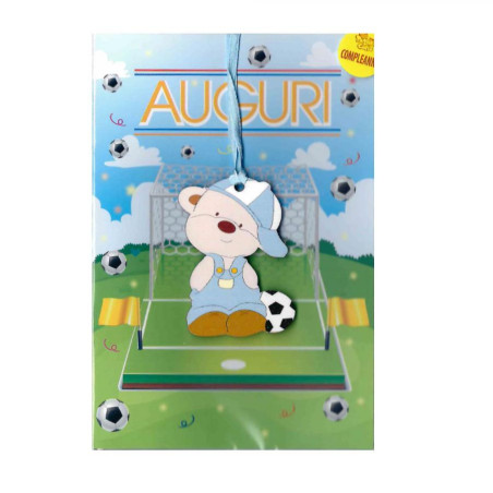 Biglietto auguri di compleanno Orsetto calciatore CELESTE con ciondolo in legno