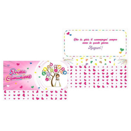 Biglietto augurale a Pochet - PRIMA COMUNIONE - Rosa con fantasia cuoricini e bimba sotto l'albero della vita - PRODOTTO IN ITALIA - biglietto di auguri ideale per accompagnare il regalo