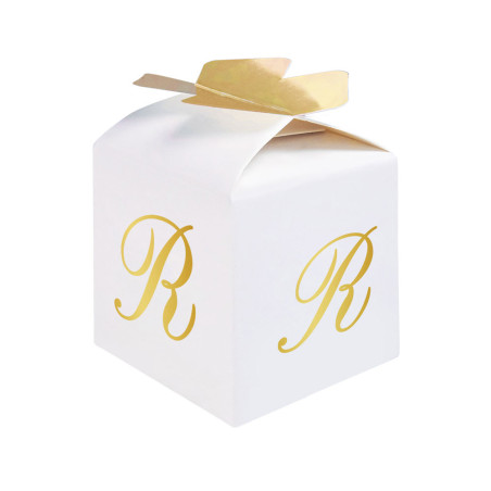 10 Scatoline portaconfetti Cubetto con Fiocco - Bianche con Lettera R iniziale in ORO lucido - in carta - 5x7x5cm - Scatola regalo in cartoncino per alimenti - ideale per comunione, cresima, matrimonio, compleanno ecc.