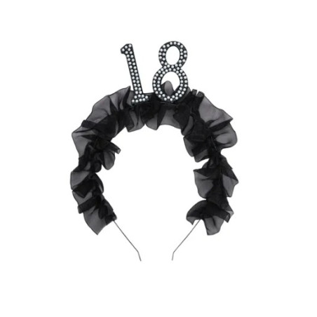 Cerchietto Frontino 18 Anni con volant in tessuto nero e numero 18 decorato con perle