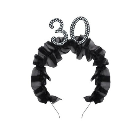 Cerchietto Frontino 30 Anni con volant in tessuto nero e numero 30 decorato con perle