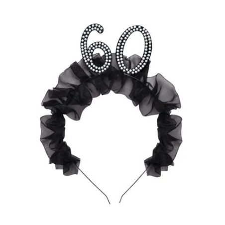 Cerchietto FRONTINO con numero 60 con volant in tessuto nero e numero 60 decorato con perle - idea scherzo gadget divertente per compleanno, feste, party, principessa