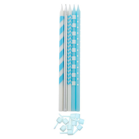 • In confezione: 2 Candele Argento, 2 Bianche con strisce Azzurro, 2 Celeste con strisce Bianche, 2 Bianche con onde Azzurro, 2 Celeste con pois Bianco