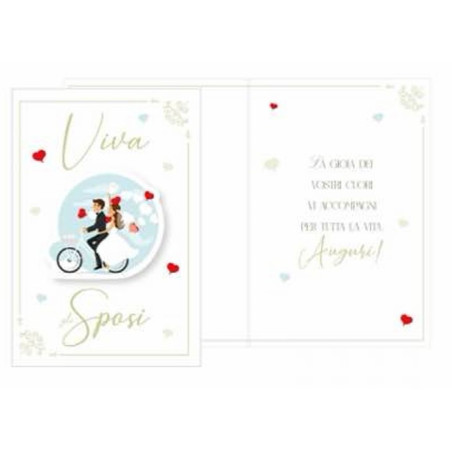 Biglietto di Auguri di MATRIMONIO Sposi - Con Ciondolo in legno Sposi in bici - biglietto augurale PORTASOLDI completo di busta