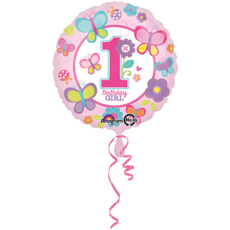 Pallone PALLONCINO in foil MYLAR Primo Compleanno Bambina - Rosa con fantasia Fiori e Farfalle