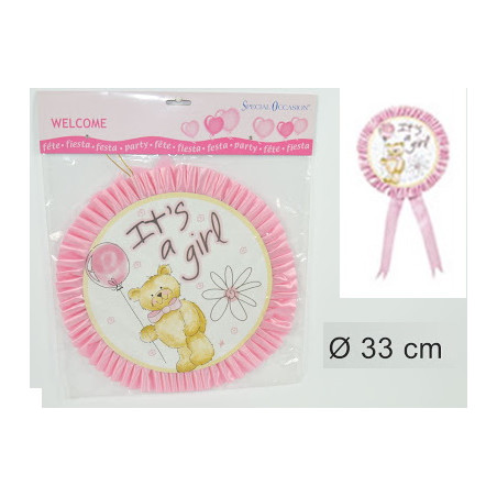 FESTONE Ruota Fiocco Nascita Rosa in carta scritta "It's a Girl"con orsetto - 33cm - ghirlanda decorazione - per decorazioni addobbo tavola per feste, party nascita bimba bambina