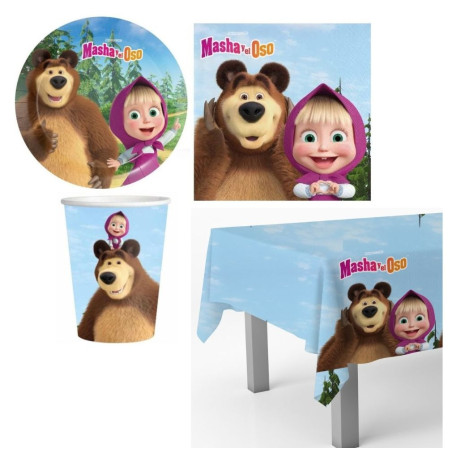 Kit coordinato tavolo Masha e Orso - coordinato Tavola MONOUSO Festa - set ideale per 8 OSPITI - per feste party di compleanno e qualsiasi occasione (8 piatti + 8 bicchieri + 20 tovaglioli + 1 Tovaglia)