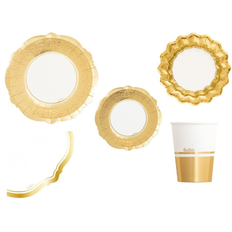 Colora la tavola della festa con tema oro e bianco. Coordinato completo per la tavola. Il kit perfetto per festeggiare in allegria e compagnia addobbando la tavola in maniera colorata e divertente il tuo Anniversario, compleanno, Natale, Capodanno