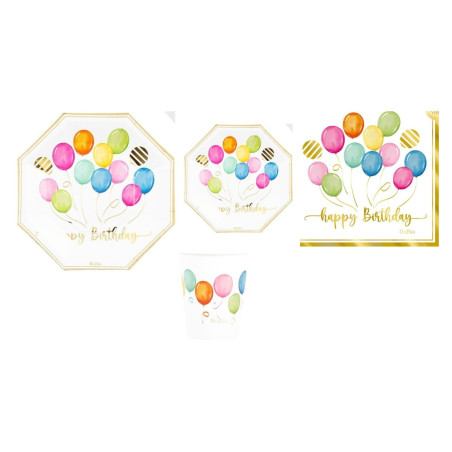Colora la tavola della festa di compleanno di tuo/a figlio/a con il suo personaggio preferito. Coordinato completo per la tavola di PALLONCINI happy birthday. Il kit perfetto per festeggiare in allegria e compagnia addobbando la tavola in maniera colorata e divertente.