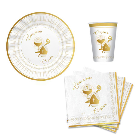 Colora la tavola della festa di Comunione di tuo/a figlio/a. Coordinato completo per la tavola di PRIMA COMUNIONE. Il kit perfetto per festeggiare in allegria e compagnia addobbando la tavola in maniera colorata e divertente.